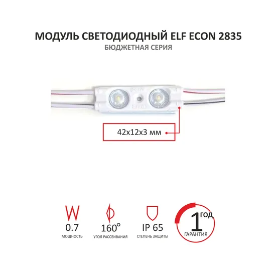 Модуль ELF-ECON 2835 W – компактный бюджетный осветительный прибор, содержащий 2 светодиода типа SMD (2835), расположенные под светорассеивающей линзой. Герметичный корпус модуля изготовлен из специального пластика, не имеет крепёжных отверстий.